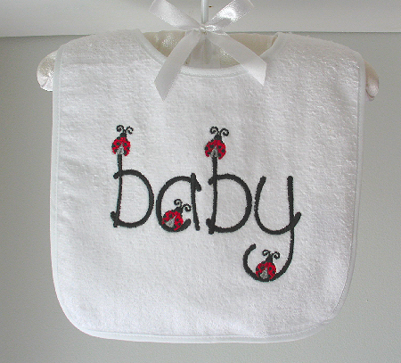 The Baby (ladybug lettered) bib is available in