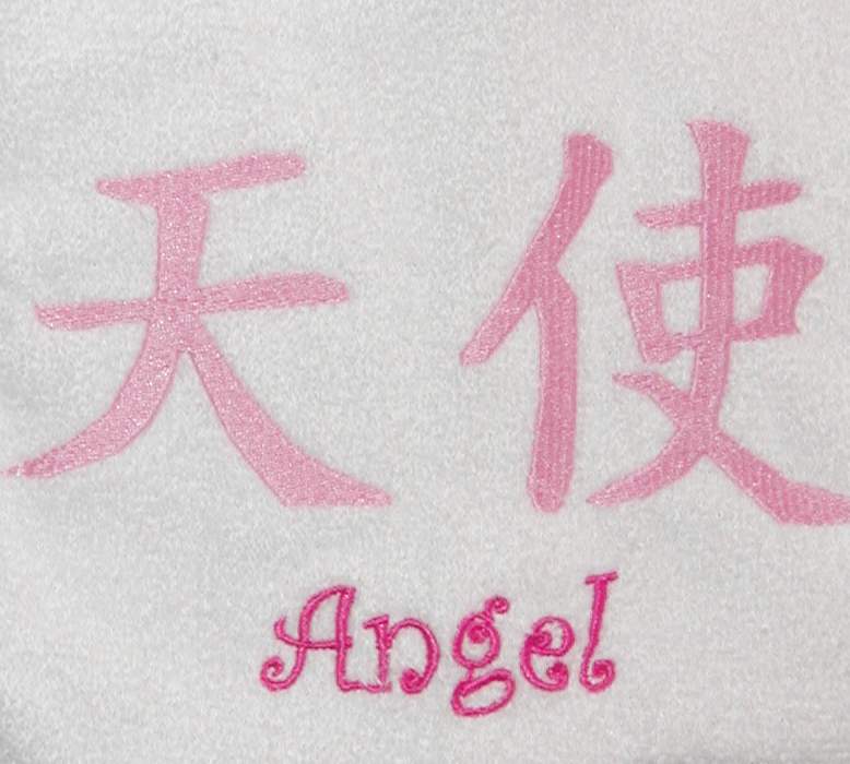 | This generously sized, full length apron is sure to keep you clean while you create your culinary masterpieces! The Angel apron is available in white, hunter, black, navy and denim. The following embroidery color schemes are offered: all pink; yellow Chinese and red English characters; pink Chinese and black English characters (on white and denim only). Aprons are 100% cotton with Teflon coating, two waist pockets, 1 pen pocket, adjustable neck strap and 1" wide waist and neck ties. Aprons measure 22"W x 30"L. Please note that the Denim apron is not Teflon coated. This design is available on other items as well. Be sure to take a look at our selection of bibs, baby blankets, carry-all bags and sweatshirts. |