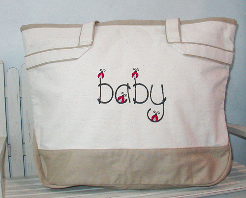 | Surprise your loved one with a truly unique diaper bag! Our beautifully embroidered carry-all bags help stylish moms to keep organized. The Baby (ladybug lettered) design is embroidered with black letters and red, gray and black ladybugs. Click to view details of new style bag or scroll down to read details below. The Baby (ladybug lettered) design is available on other items as well. Be sure to take a look at our selection of bibs, baby blankets, and sweatshirts. |
