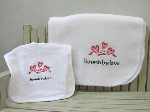 | Sweatshirts, bibs and bags are embroidered with the smaller design. The larger design is embroidered on blankets. |