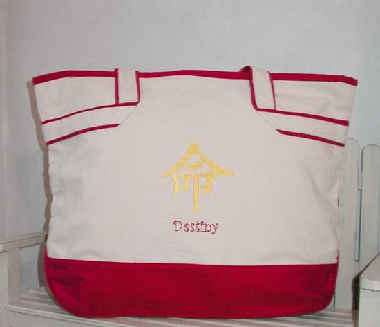 | Surprise your loved one with a truly unique diaper bag! Our beautifully embroidered carry-all bags help stylish moms to keep organized. The Destiny design is available in a variety of embroidery color schemes. To see available thread colors, click drop-down menu below. Click to view details of new style bag or scroll down to read details below. The Destiny design is available on other items as well. Be sure to take a look at our selection of bibs, baby blankets, sweatshirts and aprons. |