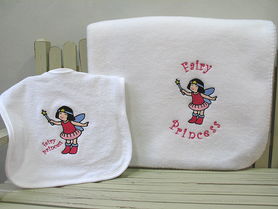 | Sweatshirts, bibs and bags are embroidered with the smaller design. The larger design is embroidered on blankets. |