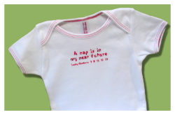 | Tell your child (and the world) how much she/he means to you...with these adorable shirts and onesies! Choose from: "You are the true good fortune of your family" or "A nap is in my near future" We also have a terrific shirt for waiting parents... "Sleepless nights are in my future" (Are they ever... As parents of three we can attest to that!) |