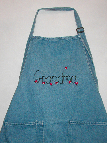 | This generously sized, full length apron is sure to keep you clean while you create your culinary masterpieces! The Grandma (with ladybugs) apron is embroidered with black letters and red, gray and black ladybugs. This design is only available on denim and white aprons. Aprons are 100% cotton with Teflon coating, two waist pockets, 1 pen pocket, adjustable neck strap and 1" wide waist and neck ties. Aprons measure 22"W x 30"L. Please note that the Denim apron is not Teflon coated. This design is available on other items as well. Be sure to take a look at our selection of sweatshirts and carry-all bags. |