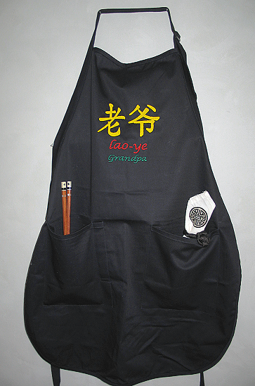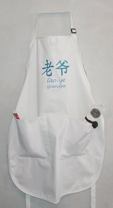 | This generously sized, full length apron is sure to keep you clean while you create your culinary masterpieces! The Grandpa (Maternal) apron is available in white, hunter, black, navy and denim. The following embroidery color schemes are offered: all blue; yellow Chinese, red Pinyin and green English characters; blue Chinese and English and black Pinyin characters (on white and denim only). Please note that the hunter apron is only available with the yellow, red and green color scheme. Aprons are 100% cotton with Teflon coating, two waist pockets, 1 pen pocket, adjustable neck strap and 1" wide waist and neck ties. Aprons measure 22"W x 30"L. Please note that the Denim apron is not Teflon coated. This design is available on other items as well. Be sure to take a look at our selection of sweatshirts and carry-all bags. |
