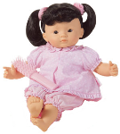 | The Kim doll is 14 inches tall with fixed black eyes. She has a soft body with vinyl legs, arms and face. Her face is beautifully hand-painted. Her hair is long, soft and gorgeous....just waiting to be brushed! This beautiful doll comes dressed in a two piece (pants and shirt) outfit. But, we just couldn't resist this dress from Chinasprout. It really completes her look. Corolle's Kim doll is meant for toddlers aged 3 years and up. |