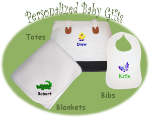 | Choose from adorable baby bibs, snuggly fleece blankets and sturdy tote bags. Customize your gifts by choosing your favorite design, font style and thread color. Personalization is included in the price of each item. Finished designs are approximately 4" x 4". |