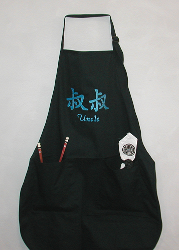 | This generously sized, full length apron is sure to keep you clean while you create your culinary masterpieces! The Uncle apron is available in white, hunter, black, navy and denim. The following embroidery color schemes are offered: all blue; yellow Chinese and red English characters; blue Chinese and black English characters (on white and denim only). Please note that the hunter apron is only available with the yellow and red color scheme. Aprons are 100% cotton with Teflon coating, two waist pockets, 1 pen pocket, adjustable neck strap and 1" wide waist and neck ties. Aprons measure 22"W x 30"L. Please note that the Denim apron is not Teflon coated. This design is available on other items as well. Be sure to take a look at our selection of sweatshirts and carry-all bags. |