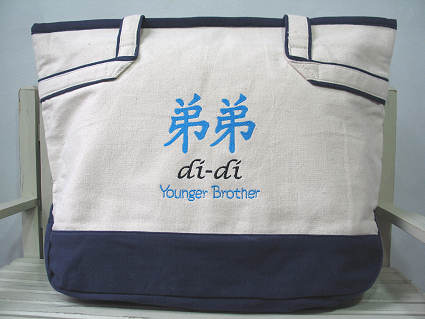 | Surprise your loved one with a truly unique diaper bag! Our beautifully embroidered carry-all bags help stylish moms to keep organized. The Younger Brother design is available in a variety of embroidery color schemes. To see available thread colors, click drop-down menu below. Click to view details of new style bag or scroll down to read details below. The Younger Brother design is available on other items as well. Be sure to take a look at our selection of bibs, baby blankets, sweatshirts and aprons. |